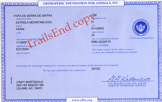 The OFA Hip report above belongs to another of our girls, Fofa. She was graded a "GOOD". OFA is much easier to understand than PennHip. They give the following passing grades: Excellent, Good, and Fair. The following grades are failing: Borderline, Mild, Moderate and Severe.